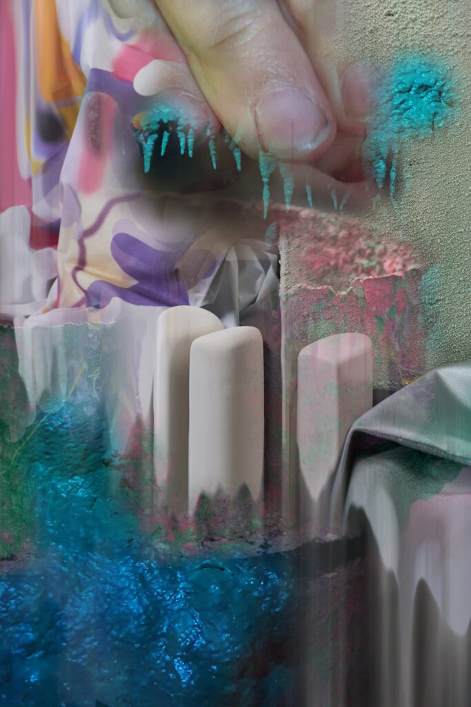 The artist also transcribes this play of scales in the images of Sans hâte et sans muscle. The series shows an assembly of photographic fragments, shots of existing works and of graphic and pictorial alterations and distortions that make use of the same processes of deformation, compression, folding and polishing that its micro-architectures undergo in the space of the real.