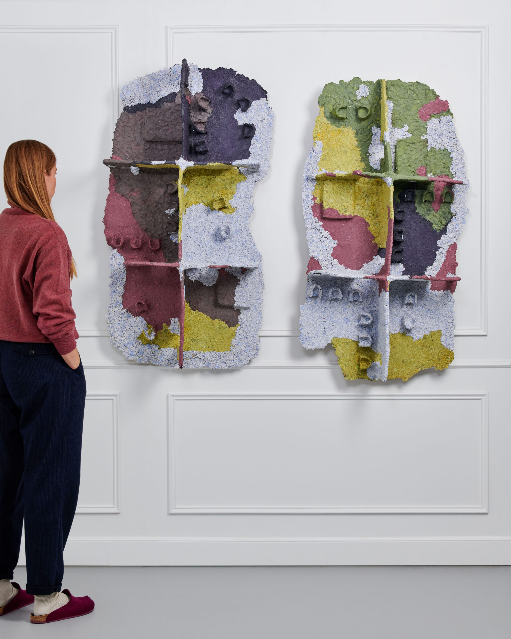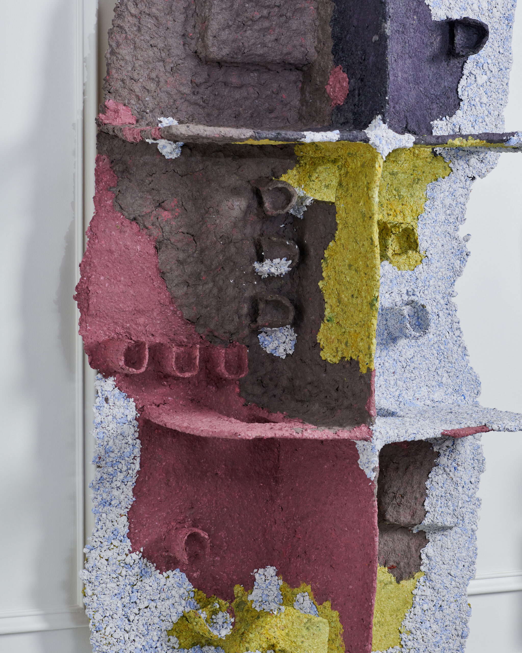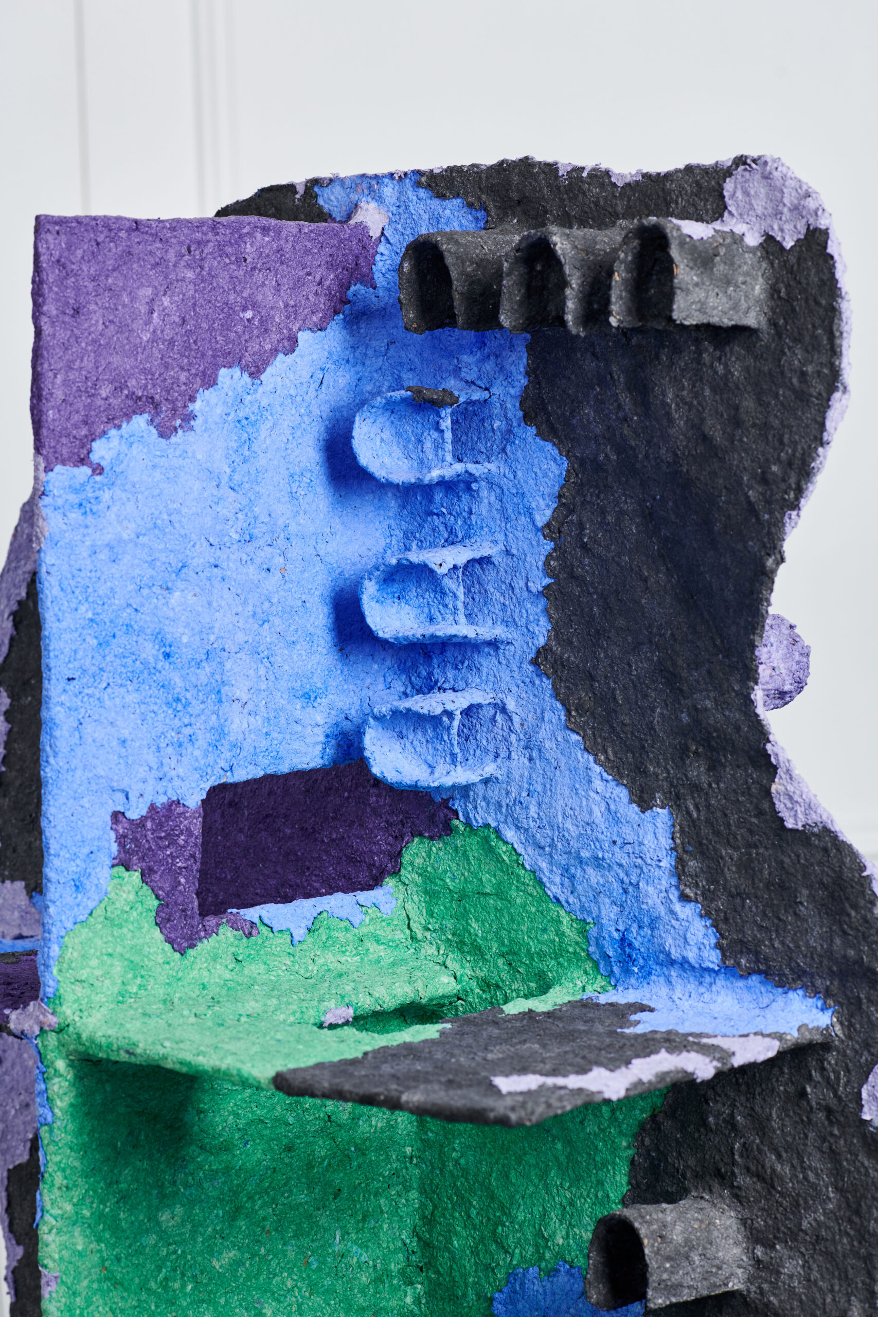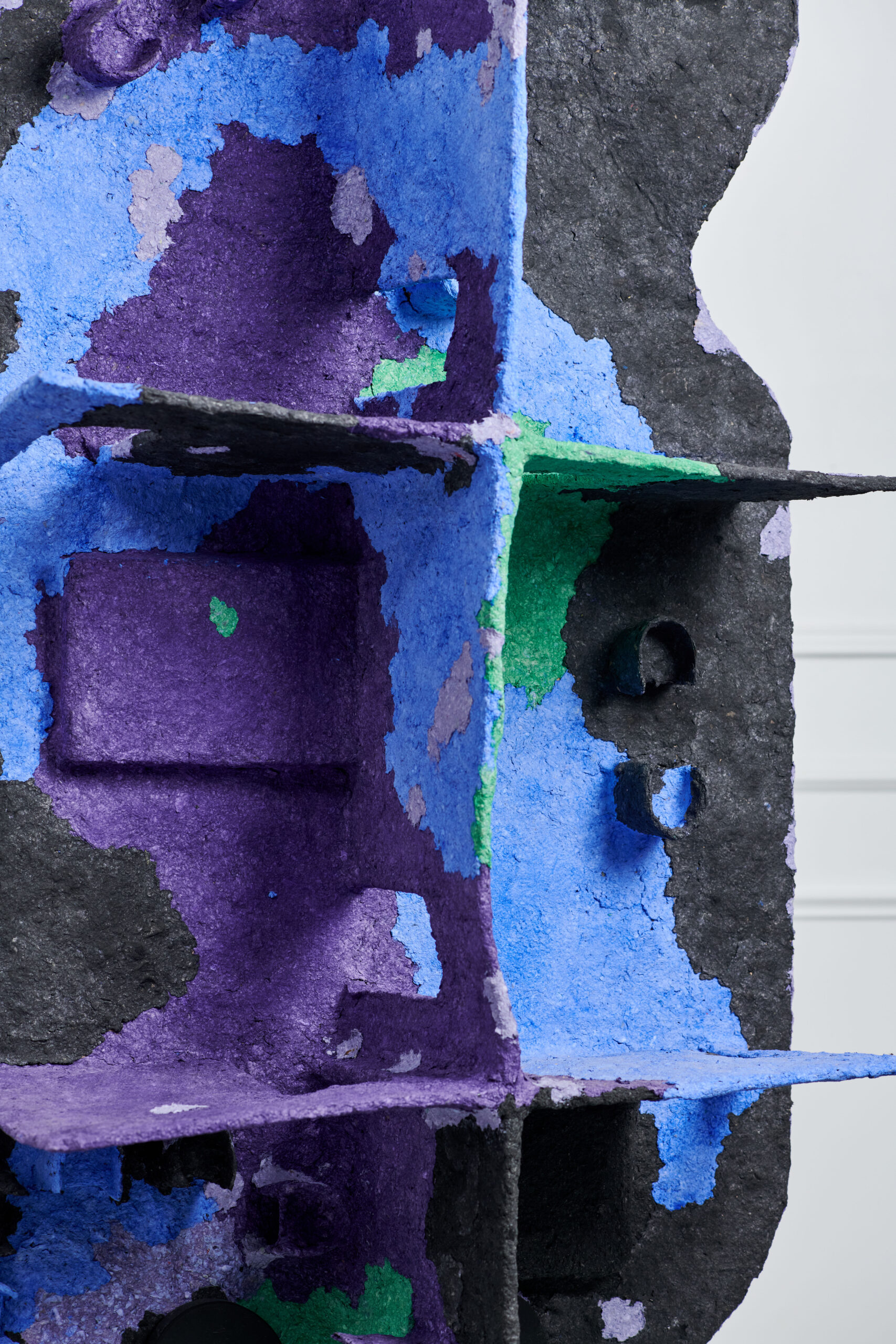 The question of appearance and representation also affects the construction material of the series. To make the three sculptures, Giuliana Zefferi used papier-mâché. A bio-sourced and compostable material. Papier-mâché is also part of an historical tradition of craftsmanship (especially in Mexico, where works made of it are called “cartón piedra”- stone). It is indeed cartón piedra, since in the exhibition views, the material resembles concrete attacked by stains of colors: ruines, lichens, simple illumination, etc. Its true nature is revealed with a magnifying glass, in the detail, whereas to scale 1/1, its appearance changes, in a perennial mimicry that accompanies observation.