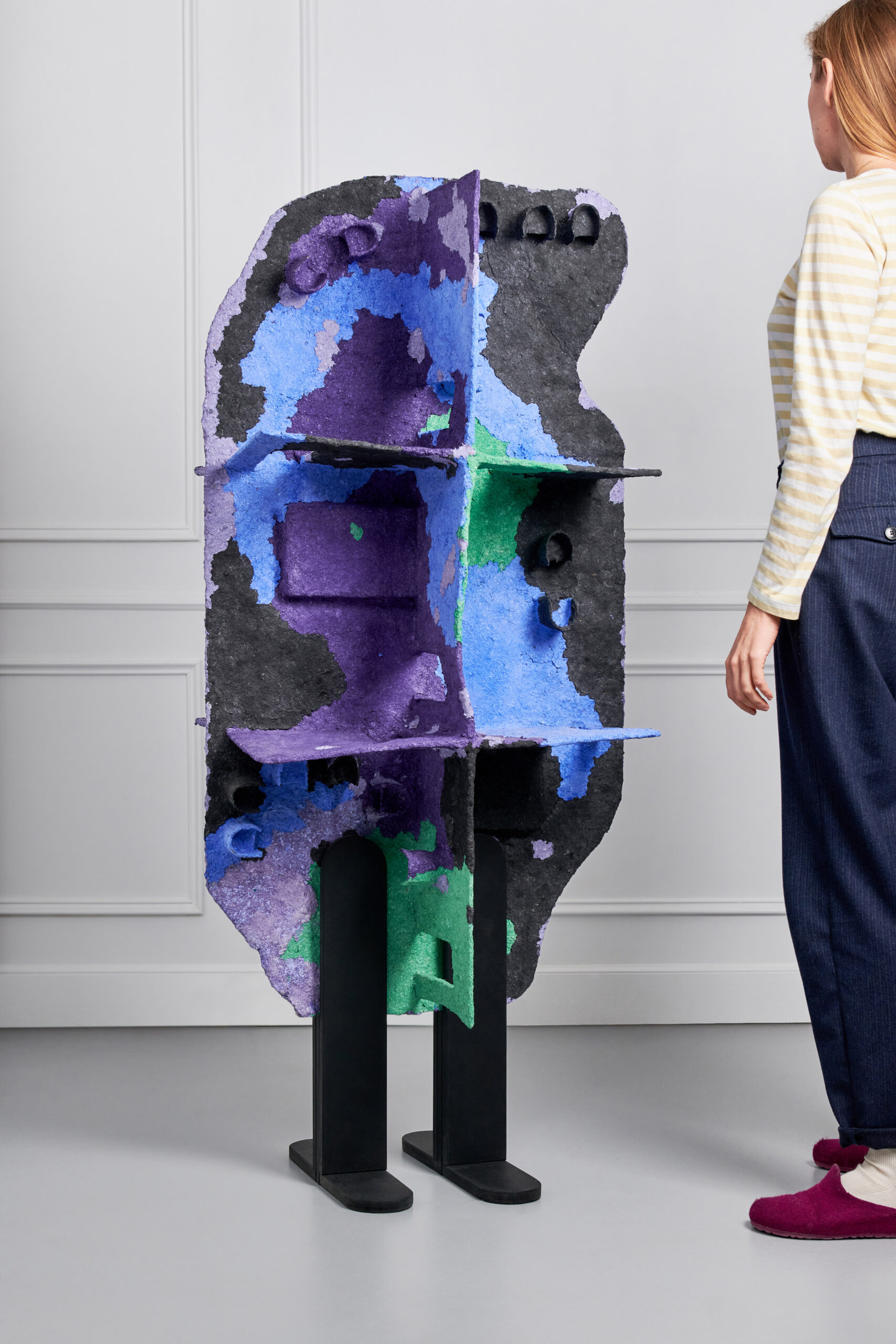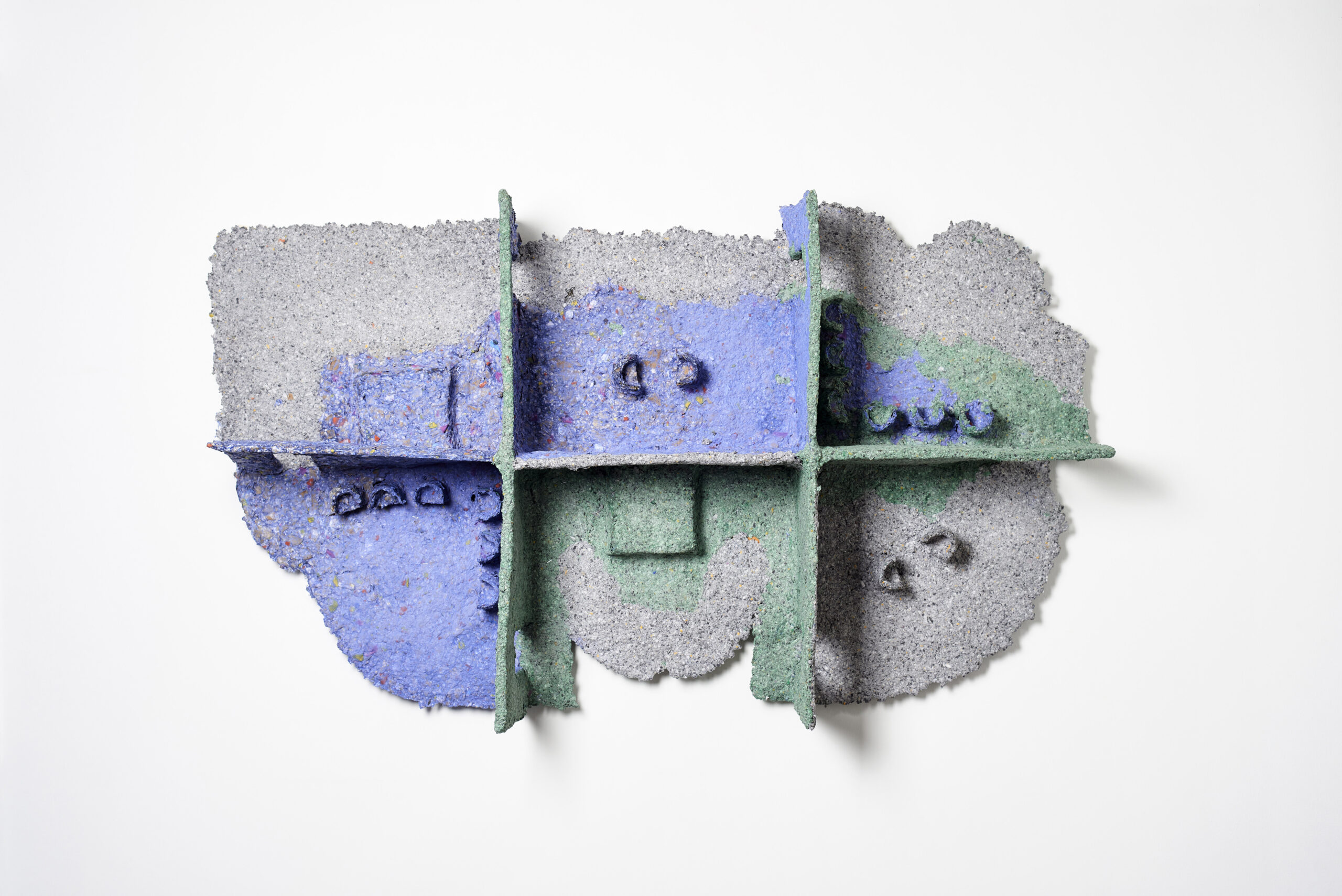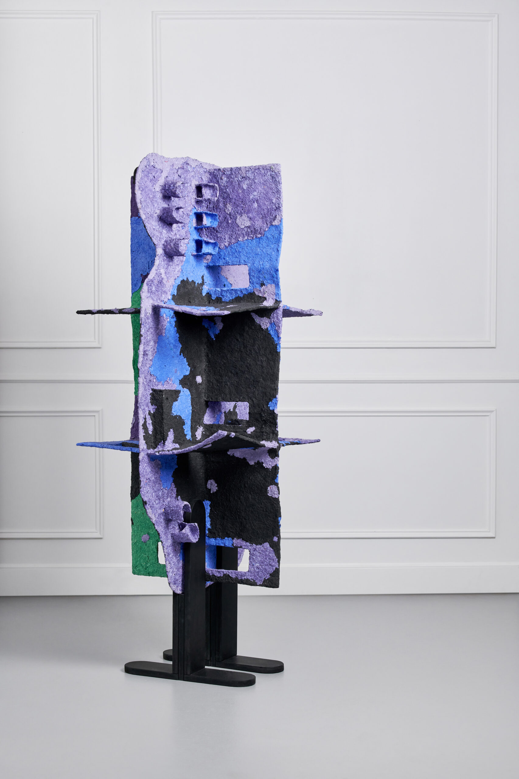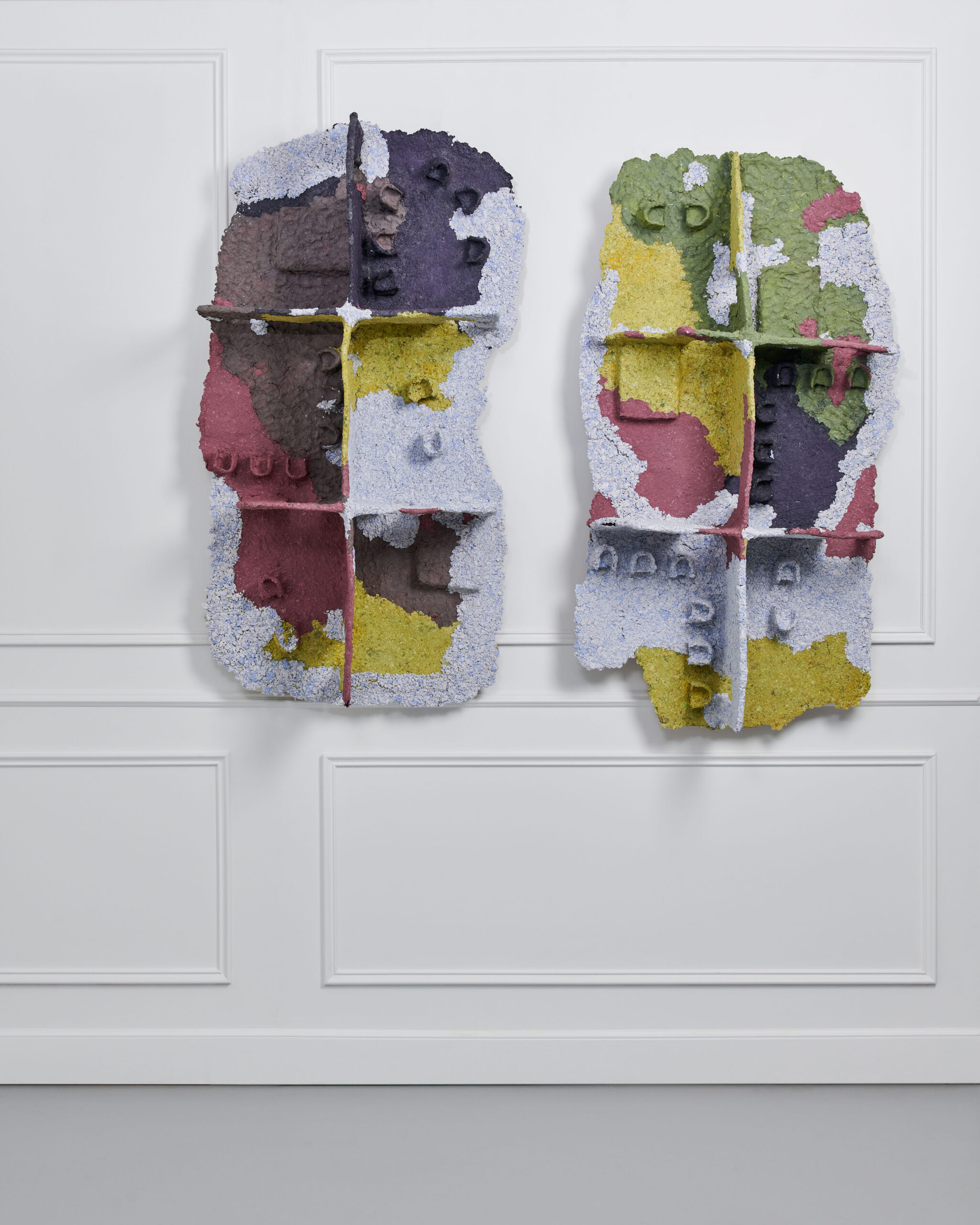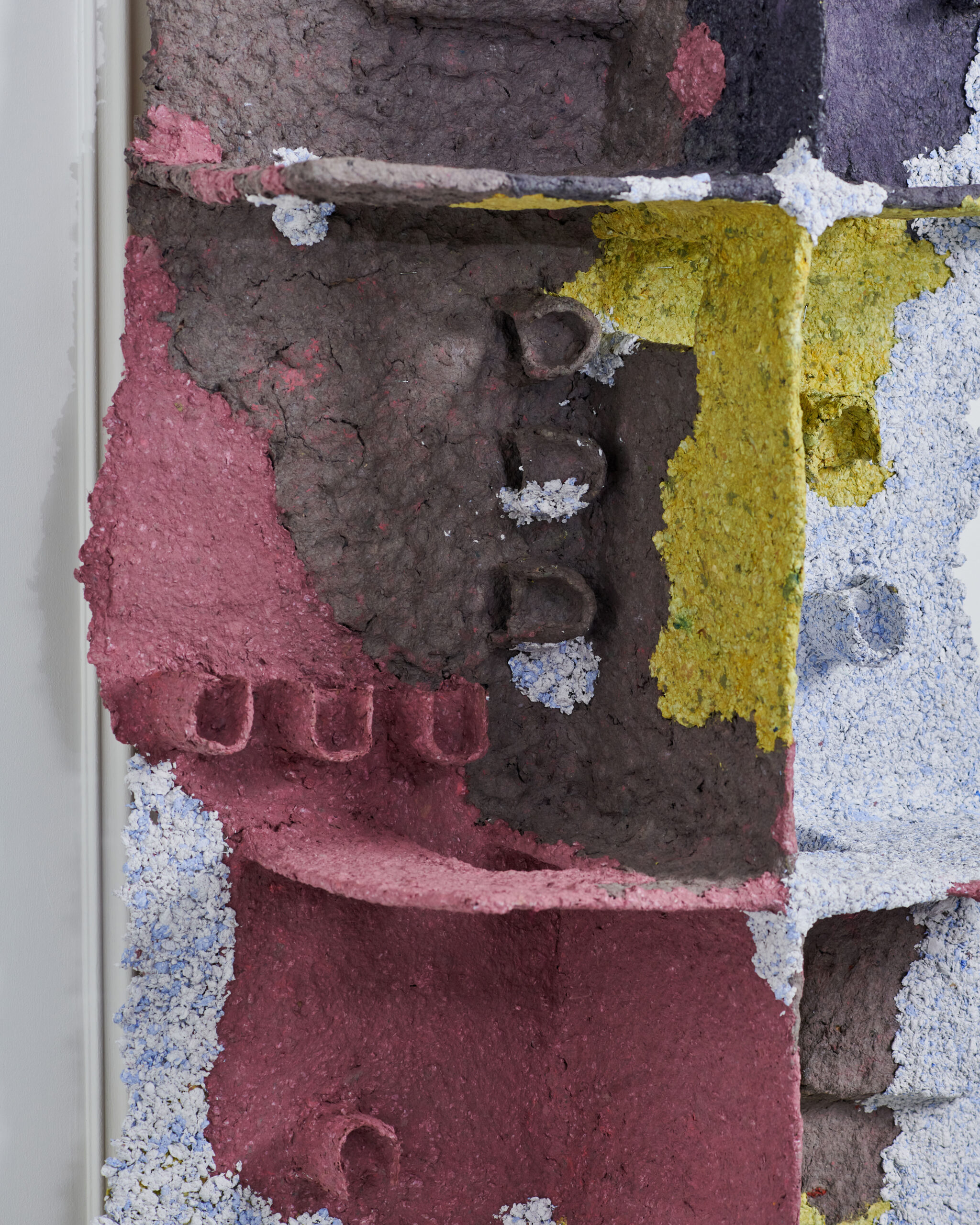 The question of appearance and representation also affects the construction material of the series. To make the three sculptures, Giuliana Zefferi used papier-mâché. A bio-sourced and compostable material. Papier-mâché is also part of an historical tradition of craftsmanship (especially in Mexico, where works made of it are called “cartón piedra”- stone). It is indeed cartón piedra, since in the exhibition views, the material resembles concrete attacked by stains of colors: ruines, lichens, simple illumination, etc. Its true nature is revealed with a magnifying glass, in the detail, whereas to scale 1/1, its appearance changes, in a perennial mimicry that accompanies observation.