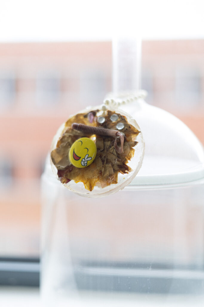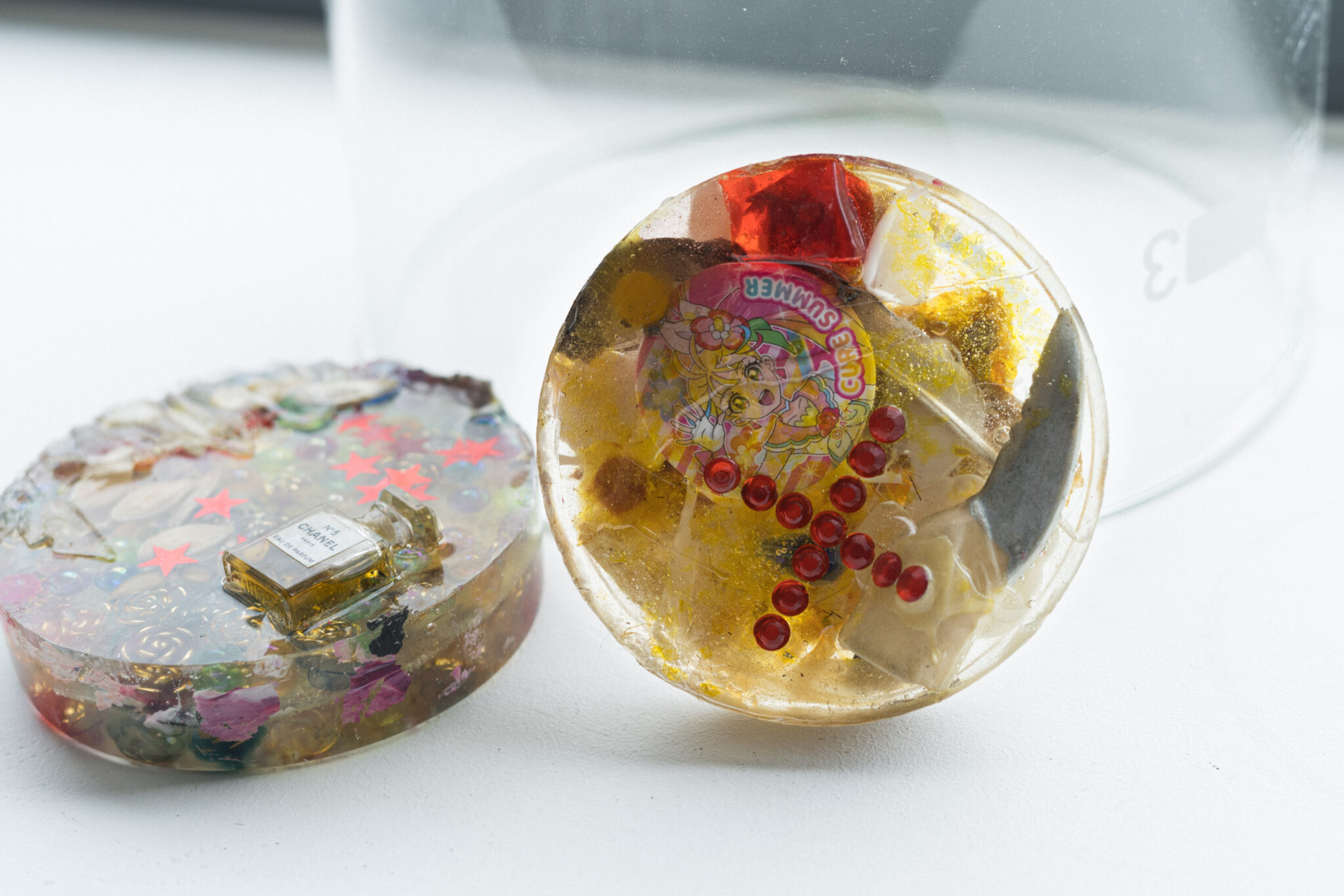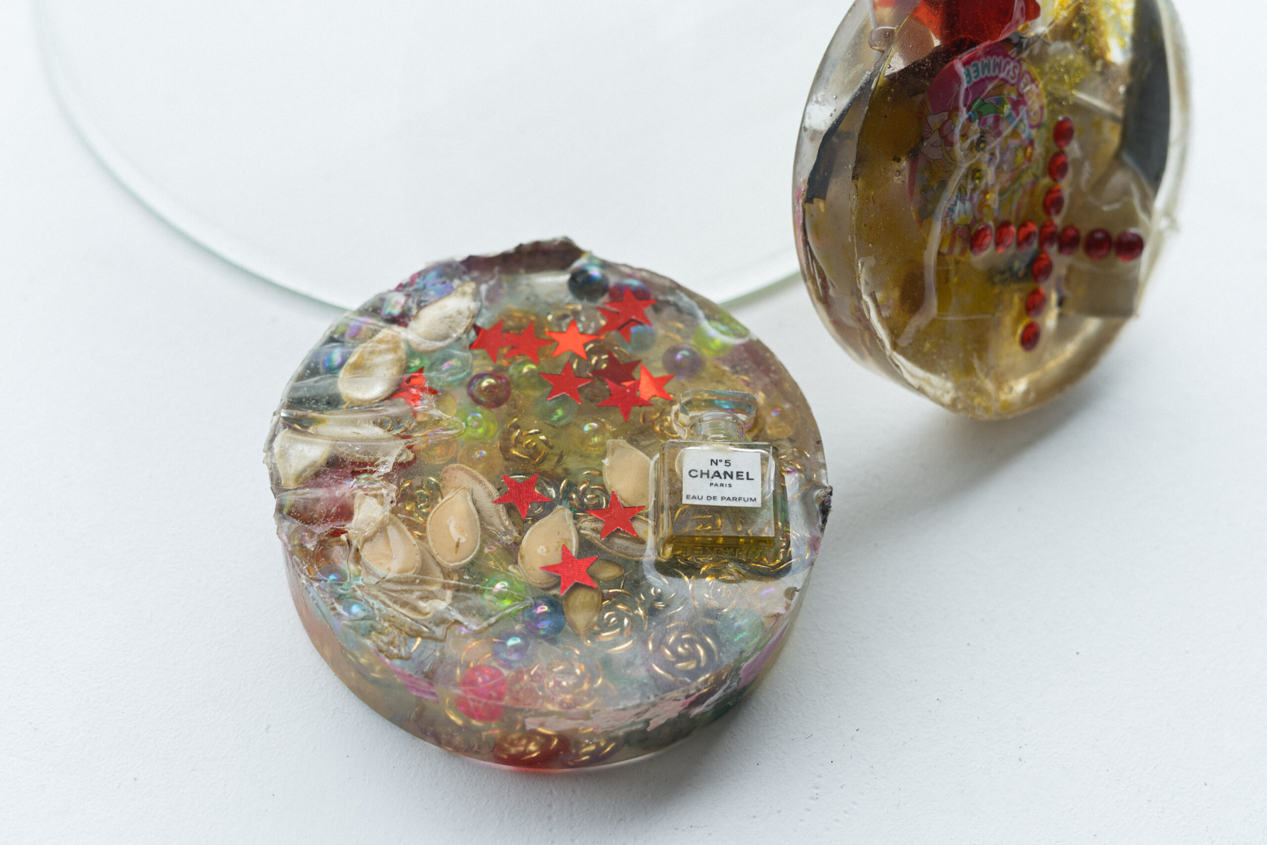 These objects are perhaps the amulets of a story that unfolds around us and of which we are unconsciously part. Touching them, appropriating them, to – in thought – plunge into their resin, scrape off their siliconised frost, ride with the witch or wear the Medallions like an ornament.
