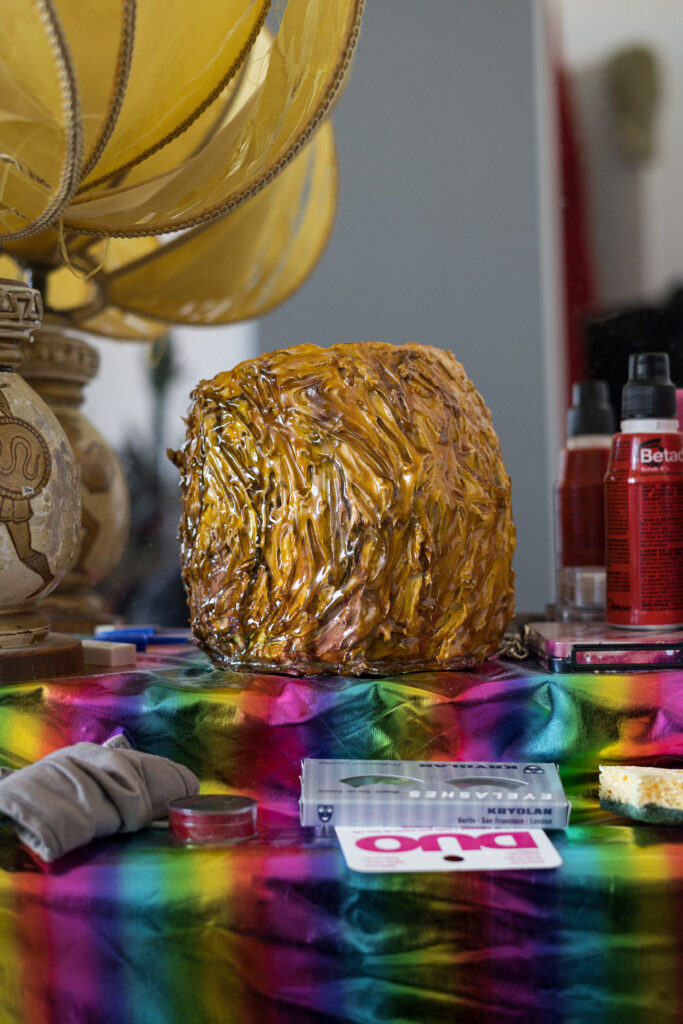 In the video, the artist’s body performs and reinterprets the icon, whereas the sculpture, set and camouflaged in the exhibition space, evolves into an installation, like a living organism. Role-playing, radio broadcasts, scenography, objects: this body of work is also the expression of a secret struggle*, a social and theoretical commitment that aims – through irony, the spectacular, the fluid – to shake up the symbol and its hierarchical impact. It is a question here of the work as an agent of a primary, subversive, feminist, queer and genderfluid action, expressed by the incessant flow of organic and inorganic substances, images and staging.