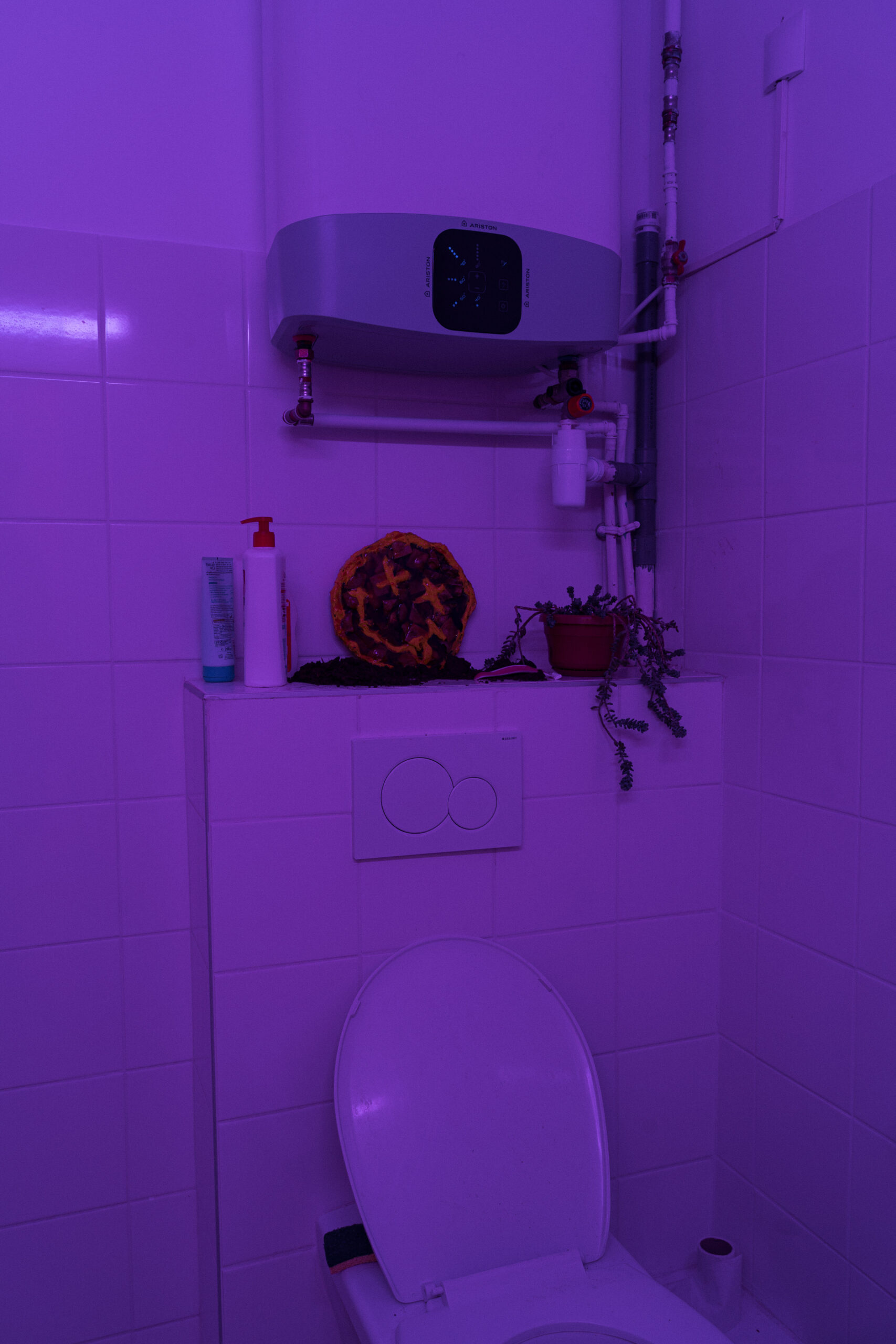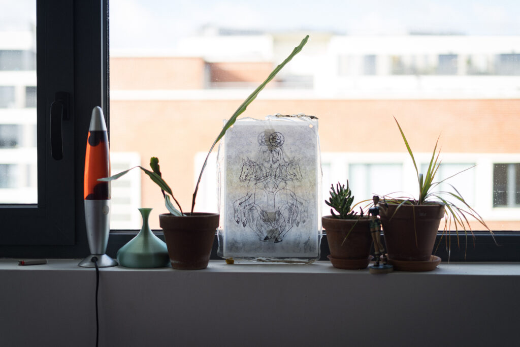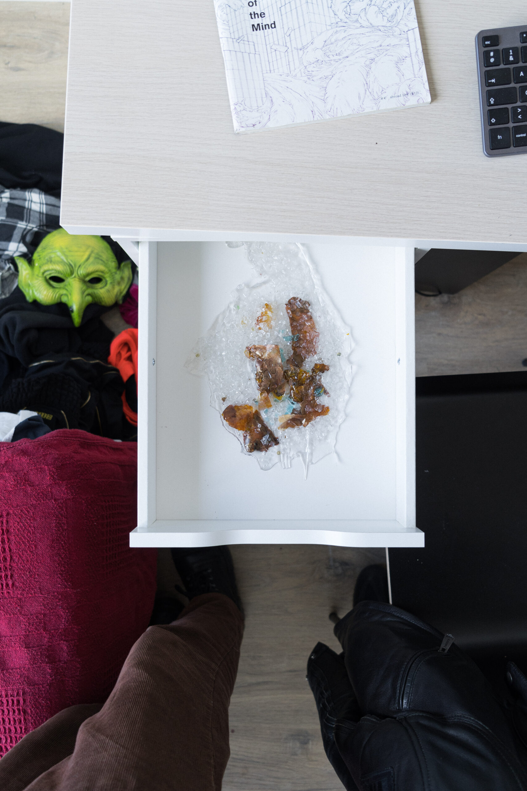 For UNBOXING #2, Louise Mervelet presents a series of fetish objects that are housed in the artist’s living space, generating a surreal cabinet of curiosities. Each image-photograph is a field scattered with clues, in which the work plays its role alongside everyday life. Lamps, fabric, foliage, chemicals, concrete, and drawers are the scenographic elements that transform the tangible into an alchemical space.