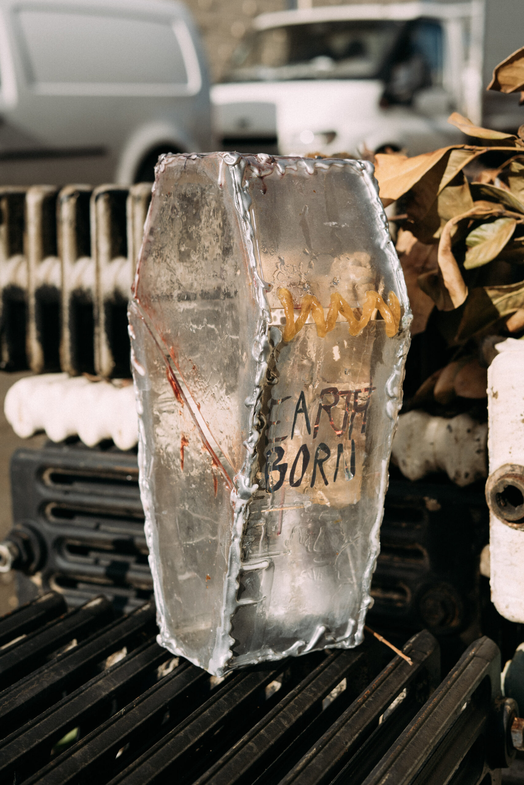 Thus, for the card-work Scopa Sorceres – as Louise Mervelet says – “The witch imprisoned in her resin is an invented figure, a scopa knight-ress, in reference to the Italian card game which does not have female figures.” The witch appears to us transparently, redoubled, in an overlap of lines and identities: woman, knight, seer. Aquarius, a jar/bowl, placed like a crystal ball on a glittering carpet, contains a treasure, a potion, a repressed desire. Looking For Trouble is the coffin waiting to be desecrated.